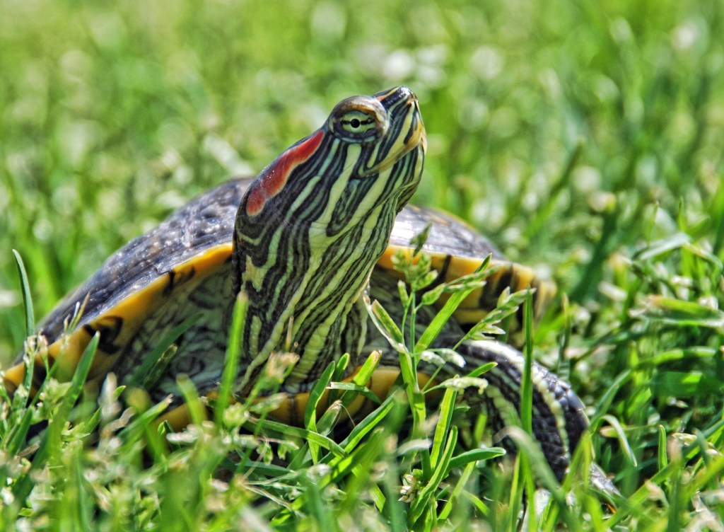 Coneguda també com a tortuga d’orelles vermelles, és semiaquàtica i, provenint d’Amèrica, s’ha convertit en una espècie invasora a gran part d’Europa. Aquest fenomen s’ha produït pel seu abandonament en hàbitats naturals desprès d’haver-se comprat com a mascota.