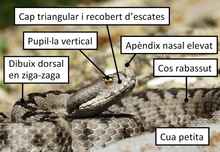 Es tracta d’un ofidi caracteritzat pel seu cos gruixut i curt, cua petita, mida variable però gairebé sempre inferior a 60 cm, cap triangular amb un apèndix nasal elevat cap amunt, pupil·la vertical i patró de coloració dorsal amb una banda negra en zig-zag sobre un fons cendrós. Aquesta morfologia el fa ser un rèptil fàcil de diferenciar respecte els altres que trobem a les nostres terres.