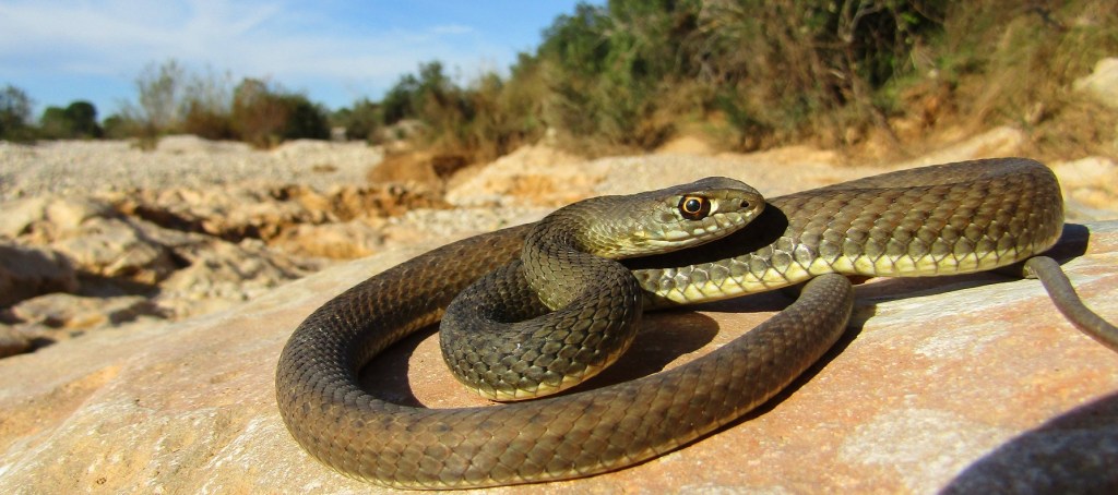 Els majors individus de serp verda (Malpolon monspessulanus), que sempre són els mascles, poden assolir gairebé 2 metres i mig de llargada. Aquesta característica la converteix no només en la serp més gran de Catalunya, sinó també en una de les més grans d’Europa. Per a fer-nos a la idea, equivaldria aproximadament al triple de la mida d’un ecurçó ibèric, una de les serps més conegudes del massís del Port.